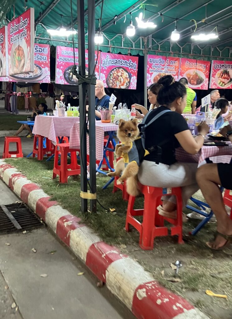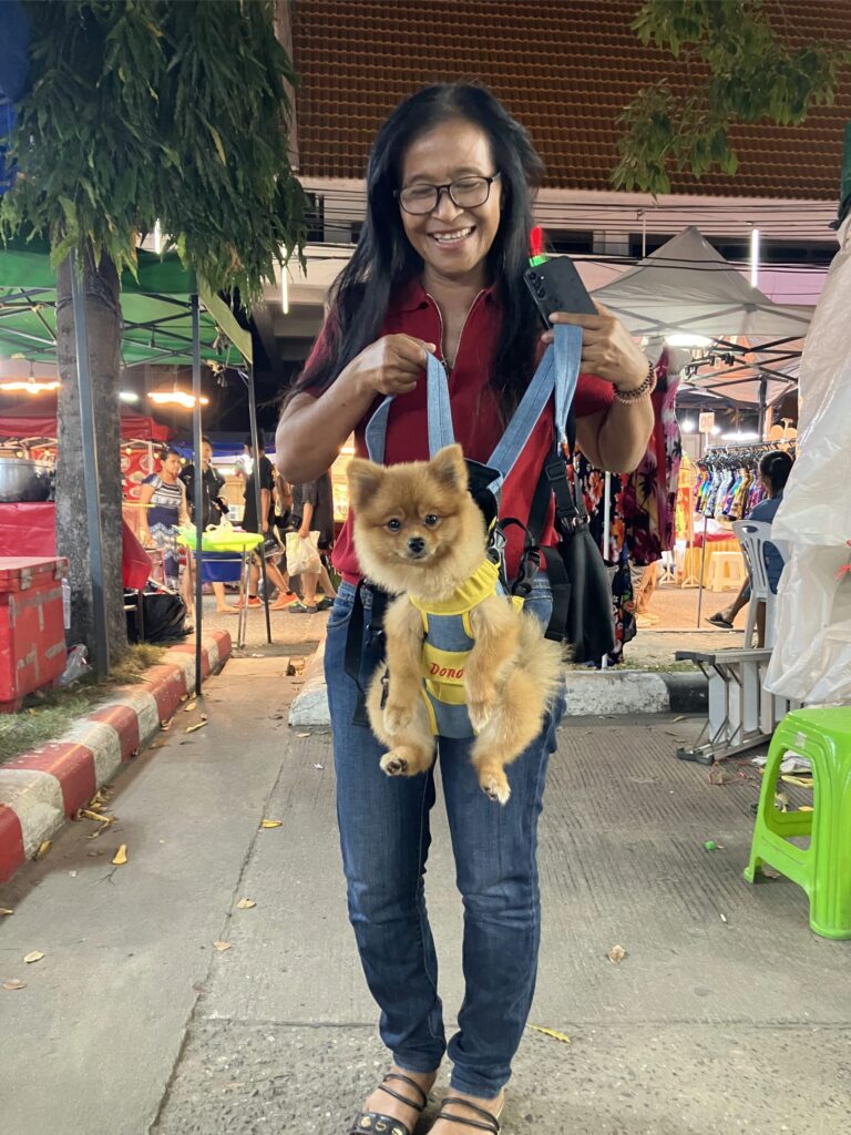 Nearby, one of the temples was doing a roaring trade and had a market selling food, clothes and various other goods going on inside the grounds. We walked past a woman sitting at a table eating dinner, she was wearing a back carrier that contained a very cute dog called Oscar. Saipa was immediately over to chat to her and try out the carrier herself!