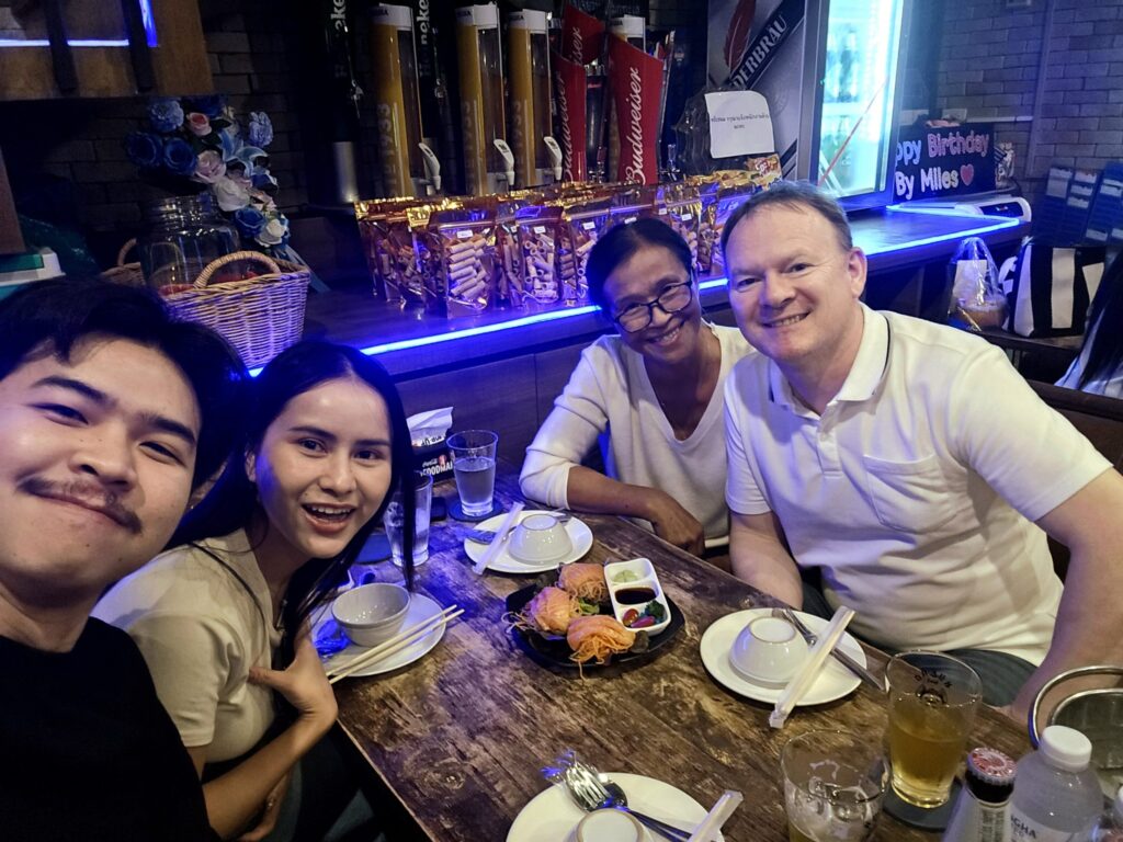 It’s been great to catch up with friends like John and Steve and some of the family. Having a beer with my friend John, he complains about being woken up at the crack of dawn this last while by a 4×4 driving past laden down with large speakers with the heavily amplified driver apparently calling out ‘good morning’ as he cruises by. John cannot quite bring himself to believe that a Thai person would drive by calling out good morning at several hundred watts just for him, especially as Steve lives nearby and has not made a similar claim. Mind you he is Australian so I suppose it would be G’day for him.