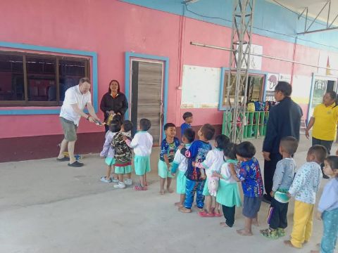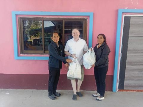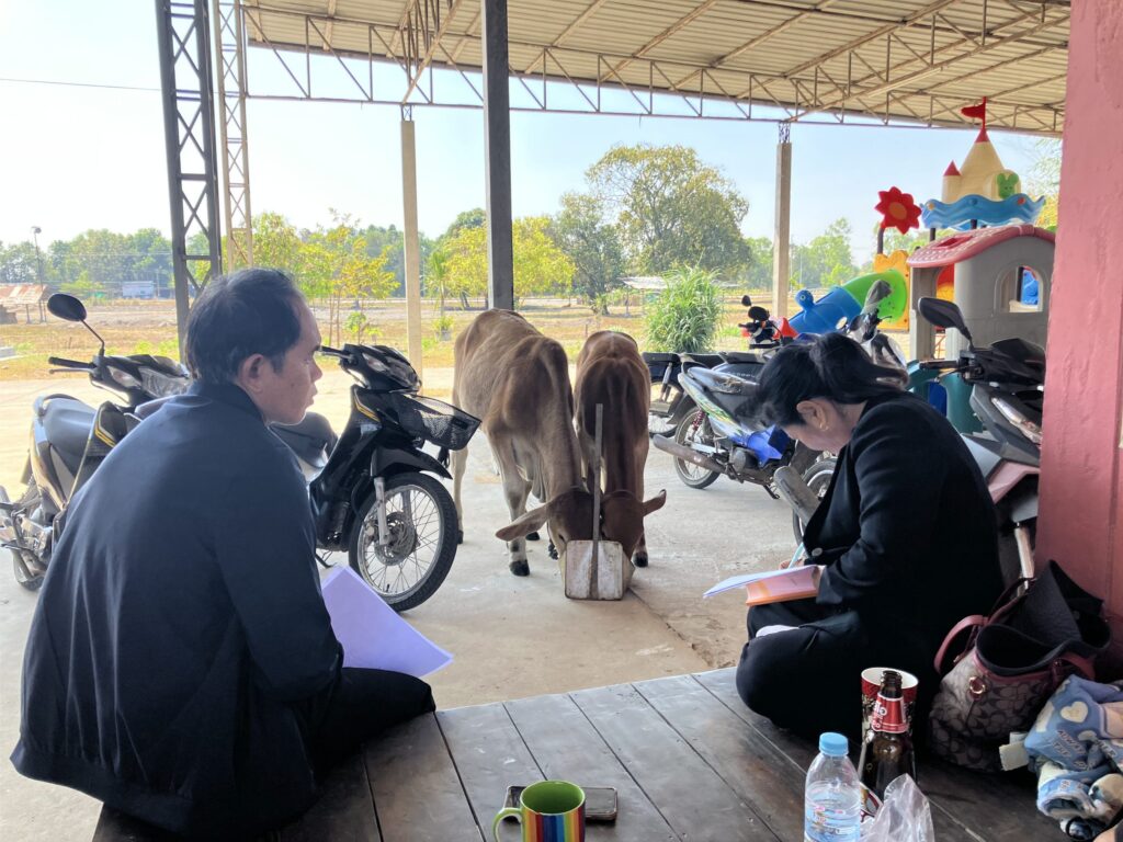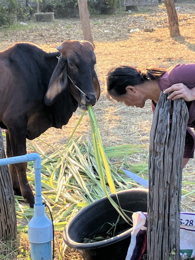 It is children’s day in Thailand and so I went to the shops to buy lots of snacks and then Sasipa and I went to the local infants school to distribute them. The children aged 2-4 were excited to see us and queued up in a line to collect their snacks one by one from me. The teachers were happy too and invited us to eat with them, while keen to try out speaking English. The difference to Europe is very marked. No fortress schools here, at least not in rural areas and there were cows strolling across the playground from time to time too. The teachers kindly gave them something to eat so they stopped in the parking area and tucked in.