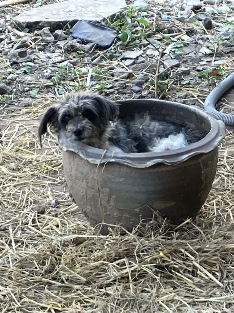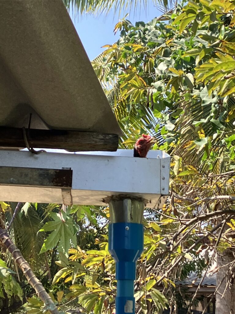 My current job is building an enclosure for the dogs (10 of them!) This means the chickens don’t get assassinated by one of them on a regular basis and they have a nice area with trees and shade that stretches from the back of the house to the front. They, hopefully, won’t be able to escape when we aren’t there and risk the neighbourhood poisoner who lives not far away. Kaio (green) was recently poisoned, but Sasipa managed to save him with various medicines and treatments, but sadly she doesn’t always win. I finished the enclosure and some of the dogs look at me reproachfully from the other side of the fence, especially Kiki, who used to be called Kymer, but rather like German shepherds after WW1 became Alsatians(until 1977). He had to have his name changed after the skirmishes with Cambodia. Other dogs love it and one has decided a plant pot is their new chill out spot and another likes to sit in the ‘swimming pool’.