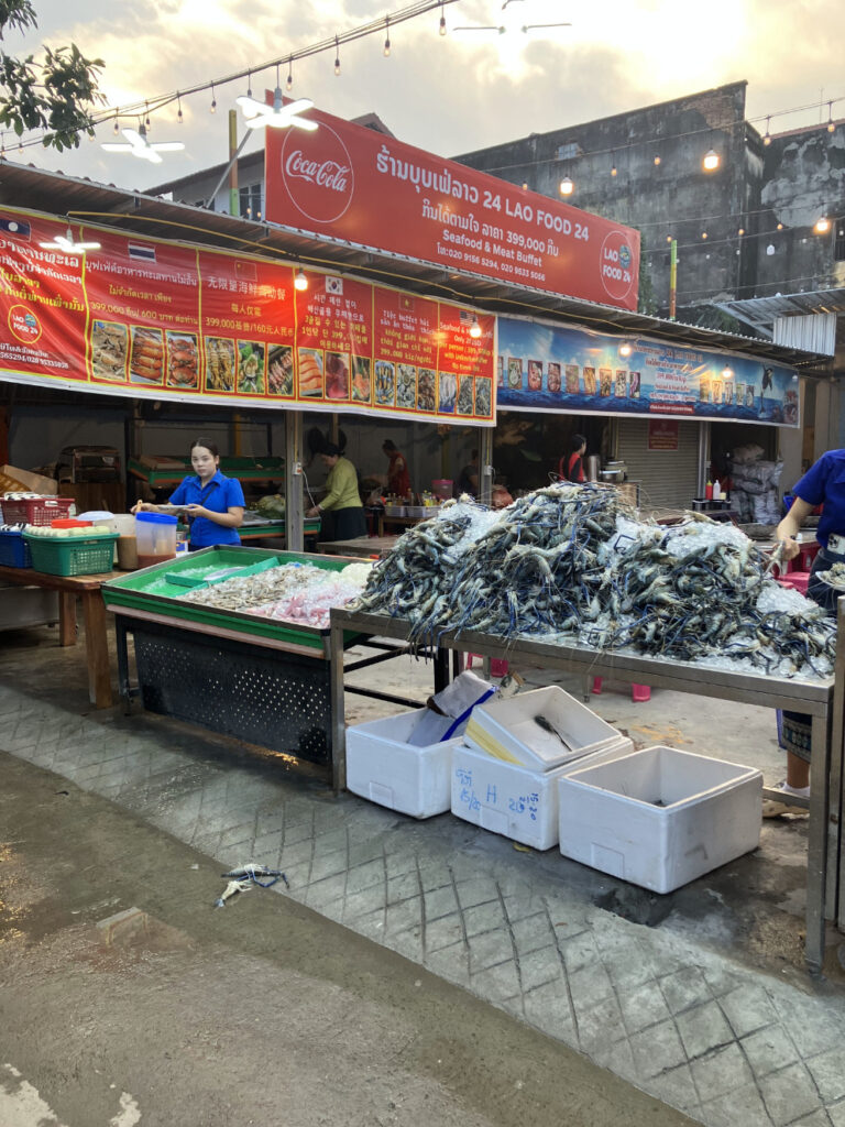 There is another food market nearby and behind it an amazing eat all you like place that has many types of seafood piled high on tables, plus lots of different meats, sauces and vegetables. A chef makes salmon and tuna Sashimi at the front and the long trestle tables are full of people tucking in. There is no time limit and it only costs 399,000 LAK (£13.50). Yes I am a millionaire again in Laos! I popped my card into the ATM and withdrew a cool 3 million. Actually a real pain, I couldn’t close my wallet! Even with such enormous sums it seems to go quickly as the prices are equally astronomical (although not actually expensive in the grand scheme of things).