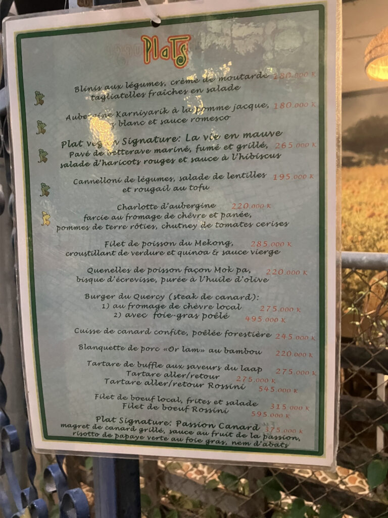 I found more evidence of the colonial past down a tiny side street. A lovely looking French restaurant called the La Cage du Coq. I took a photo of some of the menu as below. There is something for everyone from a burger Quercy, made with duck to a filet de poisson Mekong or even a vegan signature dish, subtitled ‘a life in mauve’, if that’s your thing.