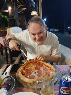 Apart from returning to the Banh mi bakery, I booked a table at a pizzeria for one of our evening meals. We had a table on the terrace overlooking the Mekong and the brightly lit boats sailing by were magical. Until, that is, there was a loud crash. Looking over the parapet of the terrace we could see two people sliding along the road under their motorbikes. It seems that some guy had come out of a side road without looking and the girl riding along the main road had crashing straight into him. Clearly the man’s fault, he limped over to his motorbike hopped on it and drove off. No number plate and no insurance no doubt. The girl was a bit shaken, but seemed unhurt and after a little while she got back on her motorbike and drove off too!