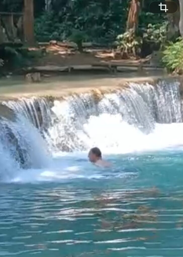 The falls are on numerous levels and having brought along my swimming gear and a towel, I had to go in for a dip. The electric blue (from the minerals) water was icy cold and fabulously refreshing after the long ride in the blazing sun and I really enjoyed it. Sasipa watched on as did the large group of Chinese that suddenly arrived, continuing to stare even as I was getting changed afterwards.